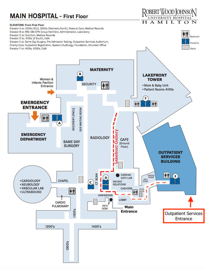 Please note: all visitors to Lakefront Gallery at Robert Wood Johnson University Hospital Hamilton are subject to New Jersey's General State Visitation Guidelines for Hospitals and RWJUHH's specific visitor policy. Please check the hospital's website here prior to your visit for the most up-to-date guidelines. Please plan to visit Lakefront Gallery during normal visiting hours of 8 am - 8 pm daily. We recommend that all visitors access Lakefront Gallery by using the hospital’s outpatient entrance (noted in the map below).